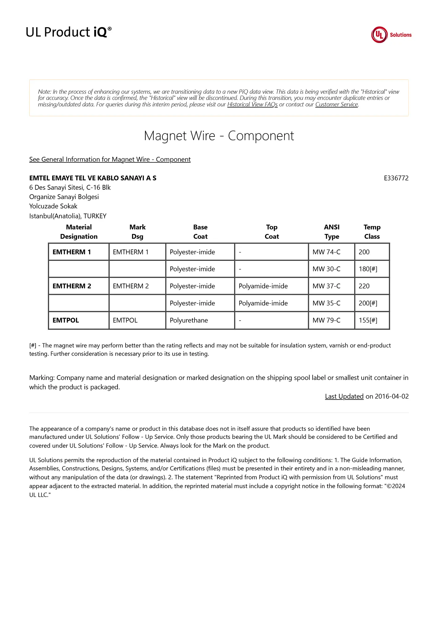 EmSold 180, HB (180°C) termal sınıfında yer alan, 0.03 ile 1.10mm çaplarında üretilebilen geliştirilmiş poliüretan emaye kaplamalı bakır teldir.[block id="shop-button-tr"]